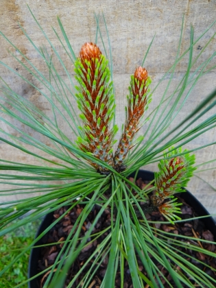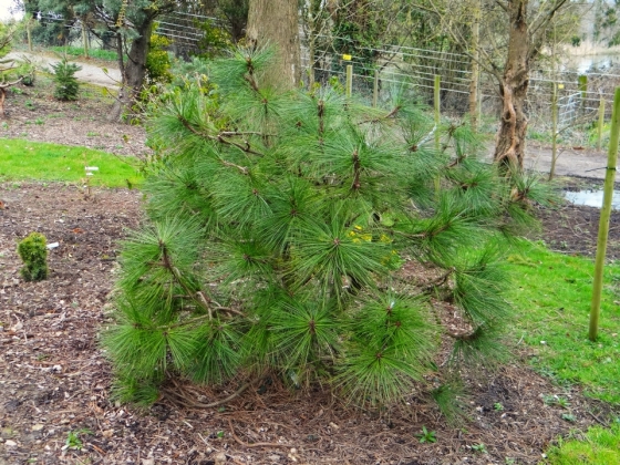Pin jaune de californie nain. Aiguilles très longues, jaune bleuté. Hauteur 3 à 4m.
