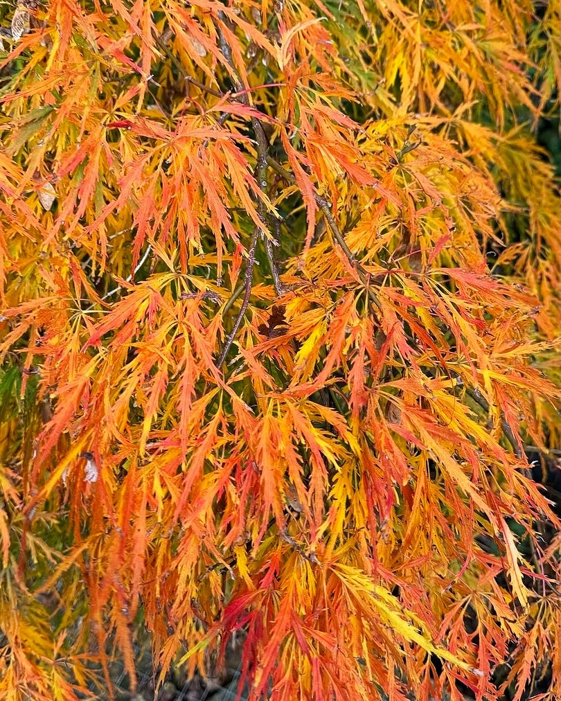 Érable du Japon pleureur de petite taille, aux feuilles vert pâle profondément découpées. Les jeunes pousses estivales sont roses, puis virent au vert chartreuse à maturité avant de se parer de teintes orange vif et rouge en automne.