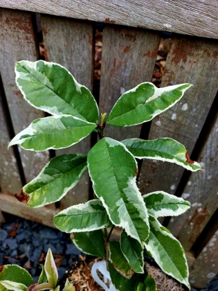 Ses couleurs sont exceptionnelles, avec une large panachure rose sur les nouvelles pousses, et la plupart des feuilles présentent une panachure blanc crème à blanc pur sur des feuilles bleu-vert.