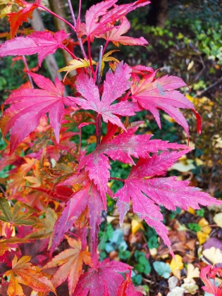 Acer palmatum 'Tobiosho' est un grand arbuste pittoresque, à croissance a plusieurs troncs, en forme d'ombrelle.