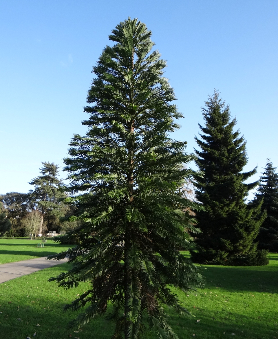 Originaire d'Australie, très vieux conifère colonnaire à tronc unique, aux longues aiguilles épaisses, vert intense. Hauteur de 10m. Exotique.