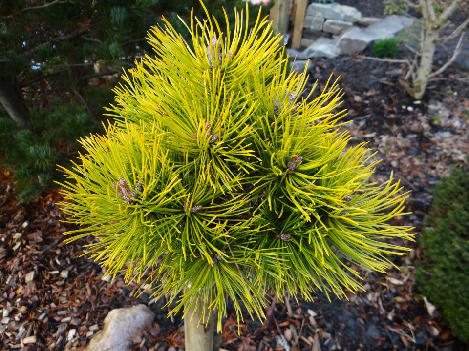 Pin miniature aux aiguilles courtes, compact et jaune intense surtout en hiver. Hauteur 50cm. Port boule.