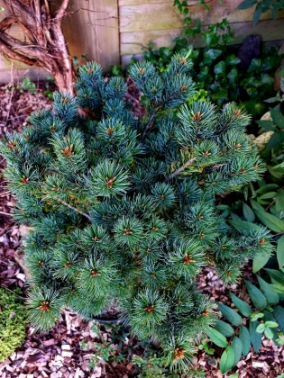 Les aiguilles sont argentées bleu-vert. Pin nain compact.