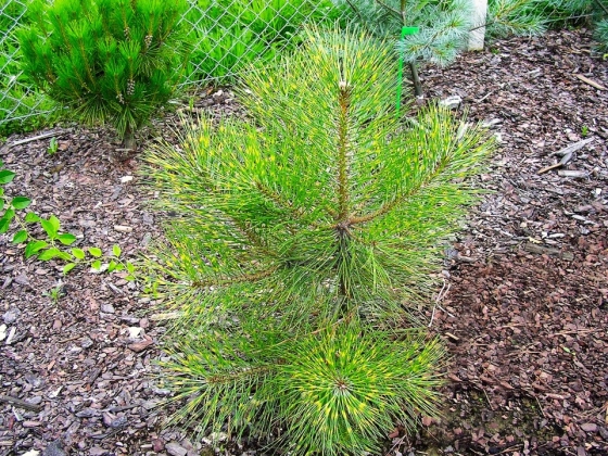 Pin nain au port érigé. Les longues aiguilles sont zébrées de jaune de façon discrète. Hauteur 1,5-2m