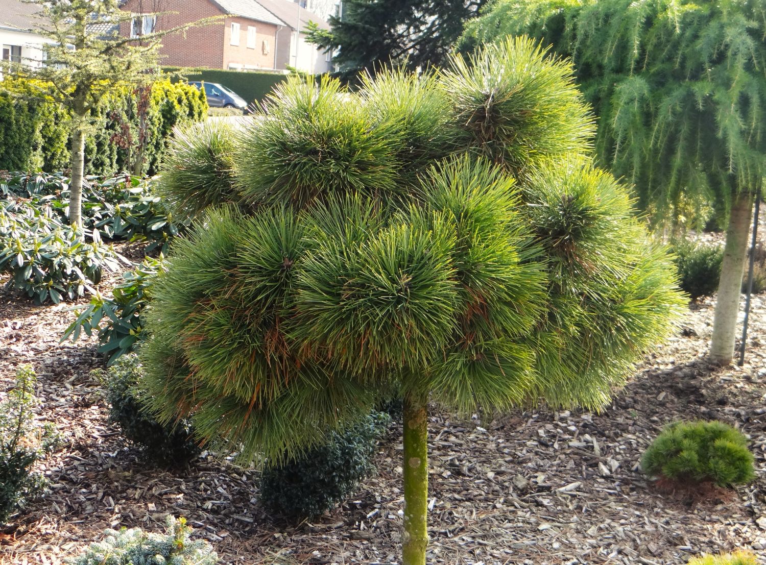 Petit pin globuleux à érigé, dense, hirsute. Longues aiguilles vert moyen. Croissance lente. Hauteur 60cm à 80cm.