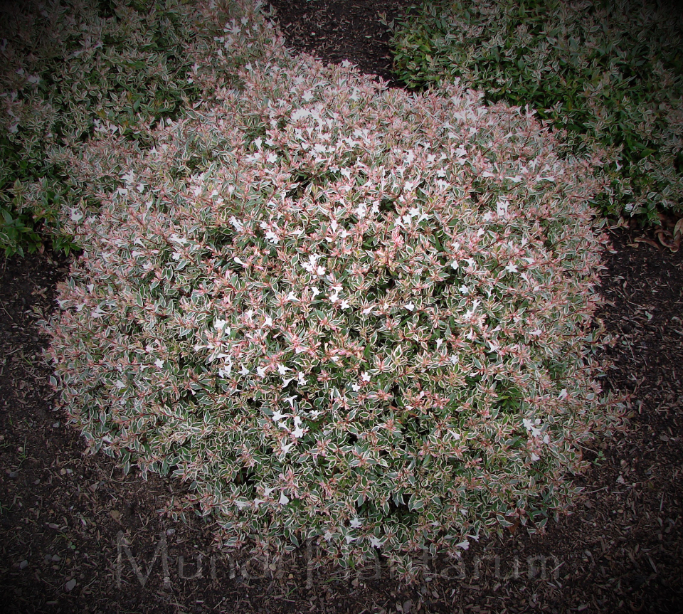 Small shrub with rounded habit and creamy white leaves. Pink red in autumn. Flowers white pink, scented in summer. Height 1m.