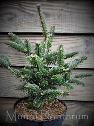 Small flaky fir, with thick needles, glaucous blue. Short branches. Hazelnut bark exfoliating in thick plates. H: 8m.