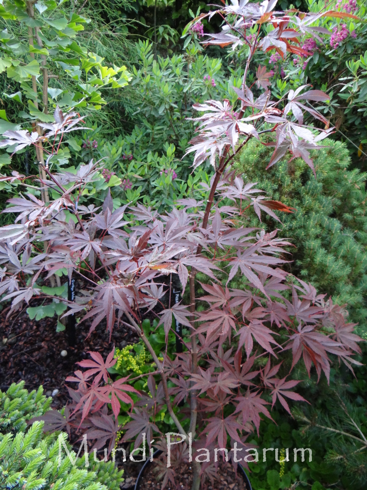 Small cut Japanese maple with purple green leaves then intense red in autumn. Height 3m, width 2m.