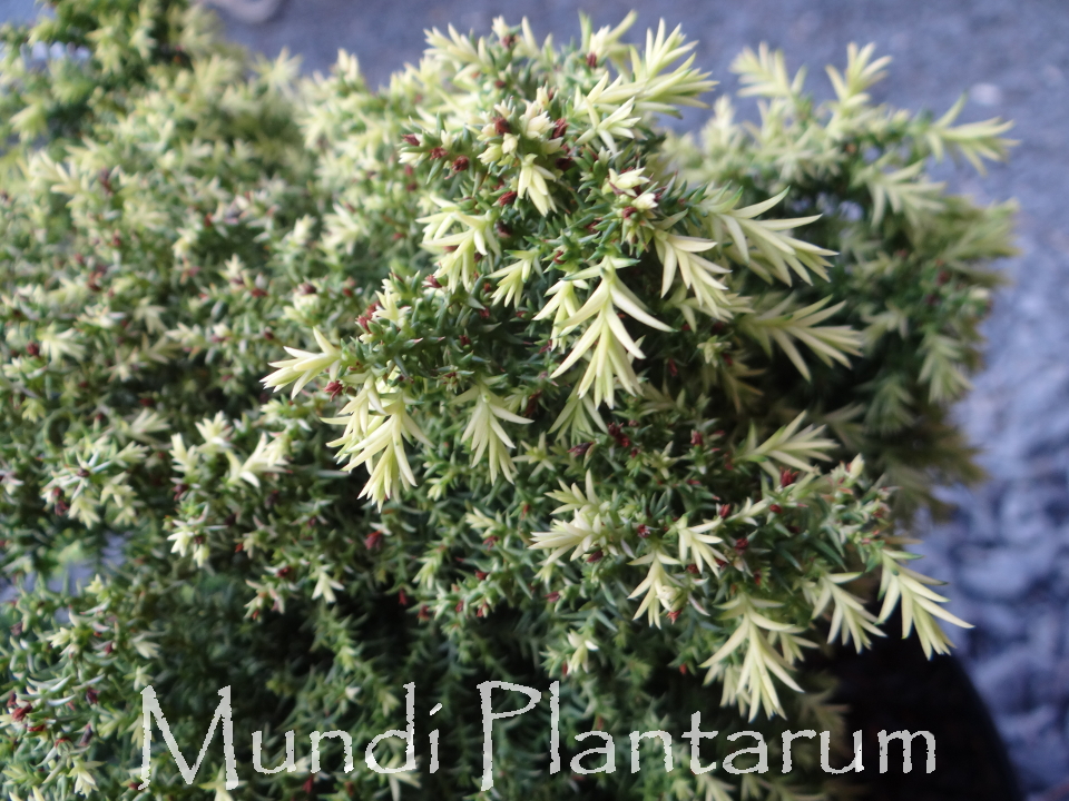 Dwarf form of Japanese cedar, lime mutation of a witch broom. Globular, dense port. Height 50cm.