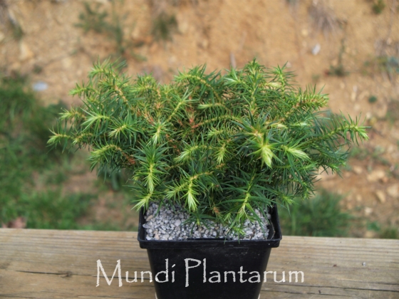 Miniature conifer with persistent, triangular, thick and pointed needles. Rusty green. Height of 20cm, width of 40cm.