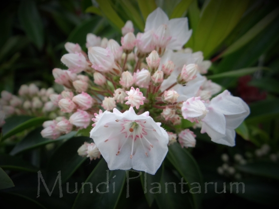 Erected mountain laurel, compact, shiny green evergreen foliage. The leaves are smaller than the type. Pure white flower in June. Height 80cm.