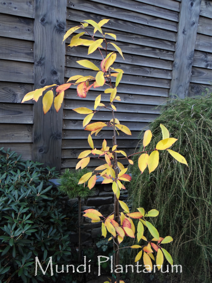 Tupelo in the shape of a pyramid, rather narrow. Leaves shiny green, then orange red veined with yellow in autumn. Height 12m.