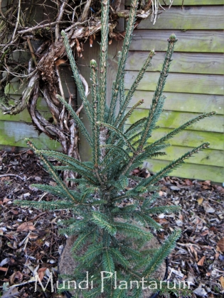 Common spruce selected in Russia, with a relatively narrow habit, a soaring and unruffled head, very dark green shaggy twigs. Height from 3 to 5m.