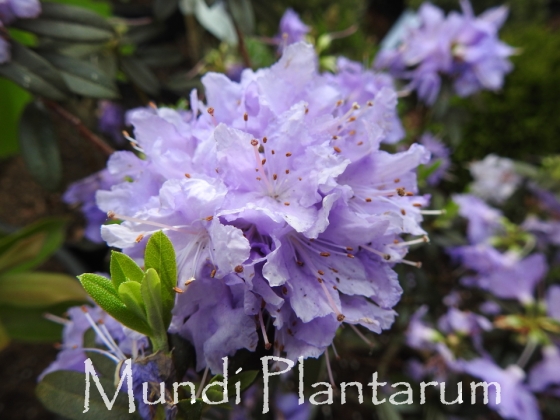 Dwarf Rhododendron with blue lavender flowers in small tight pom-poms. Height 40cm, width 60cm. Ideal for rockeries.