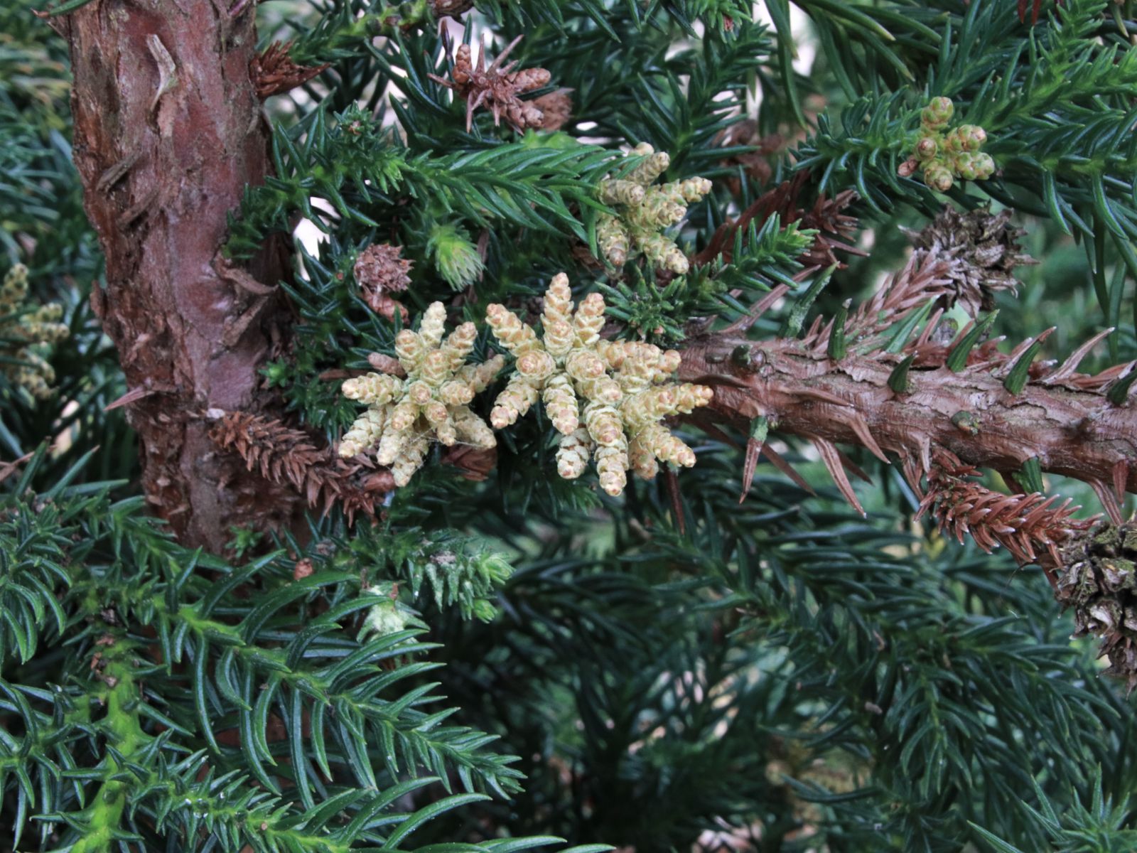 Les sujets mâles, quant à eux, portent des cônes, ou plutôt des chatons cylindriques pendants, à l’extrémité des rameaux courts, semblables à ceux des autres familles de conifères.
