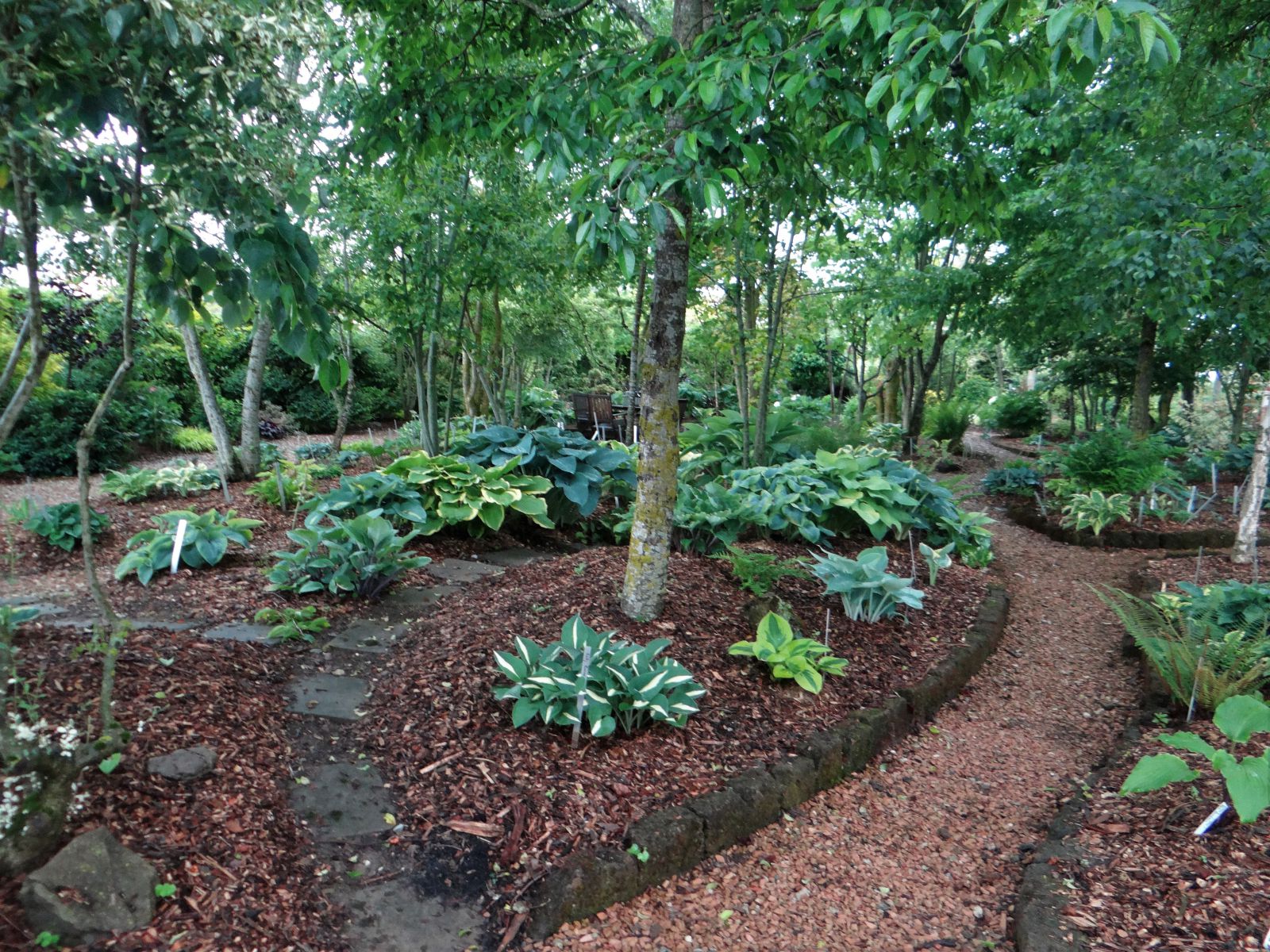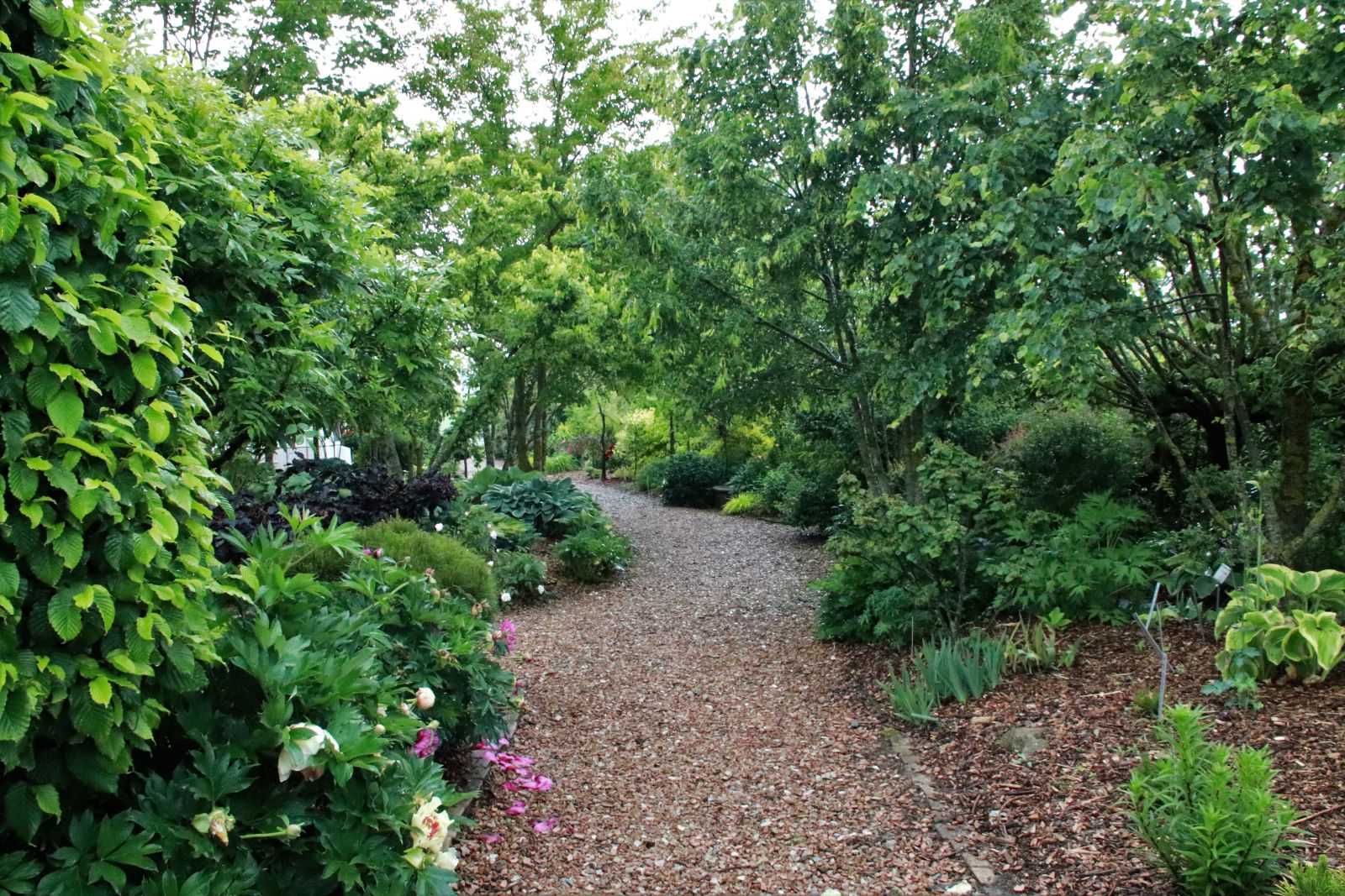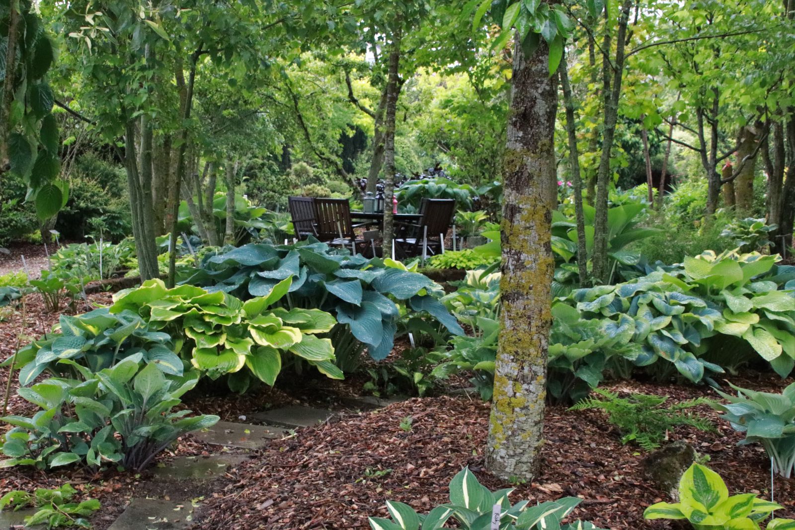 Très vite, on découvre les premiers centres d'intérêt: des arbres rares, aux feuillages particuliers, des pivoines pour une touche de couleurs vives et des hostas, en pleine terre, pour la richesse des feuillages.