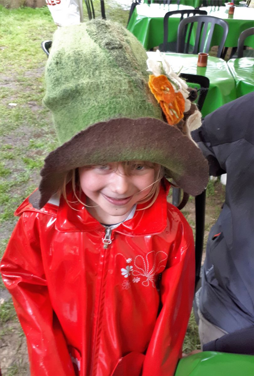 Dimanche il a beaucoup plu et Bernard Cwiek des Hôtels à insectes lui a pretté son beau chapeau de lutin géant.