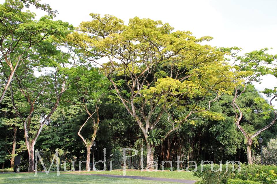 Avec son petit kiosque hexagonal blanc et son cercle d’arbre de pluie au feuillage jaune (Samanea saman Yellow form), on jurerait vivre une belle saison d’automne quelque part dans un jardin anglais.