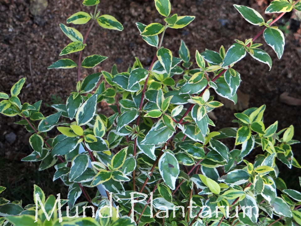 Arbuste régulier aux feuilles panachées de blanc et fleurs blanches de juillet à Septembre. Hauteur 1,2m.