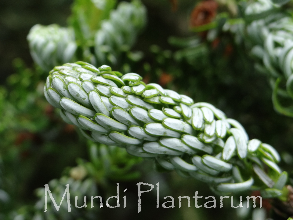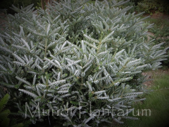 Sapin de Corée en large buisson applati. Aiguilles courbes au revers très blanc. Hauteur: 1,2m, Largeur: 2m.