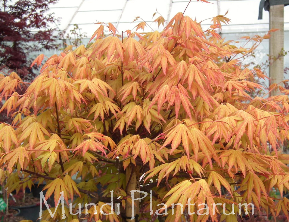 Erable du japon arbustif aux feuilles vert tendre à jaune légèrement marginé de rouge et orange feu en automne. Hauteur 2m.