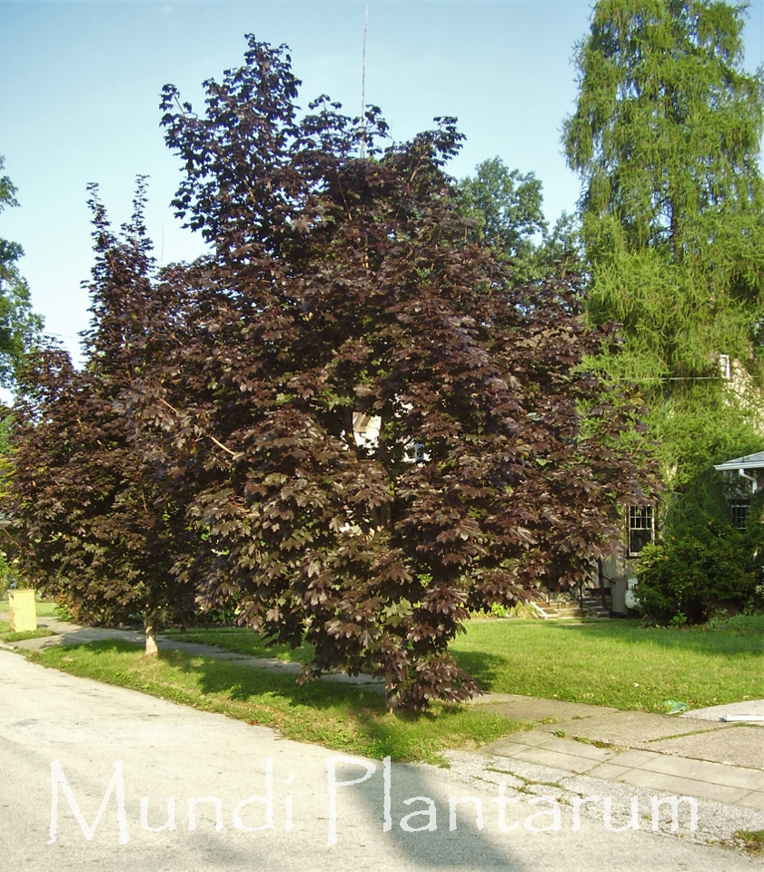 Erable plane au feuillage pourpre à noir rosé. Les fleurs jaunes printanères sont très abondantes et contrastent avec le feuillage naissant. Hauteur 12 à 15m.
