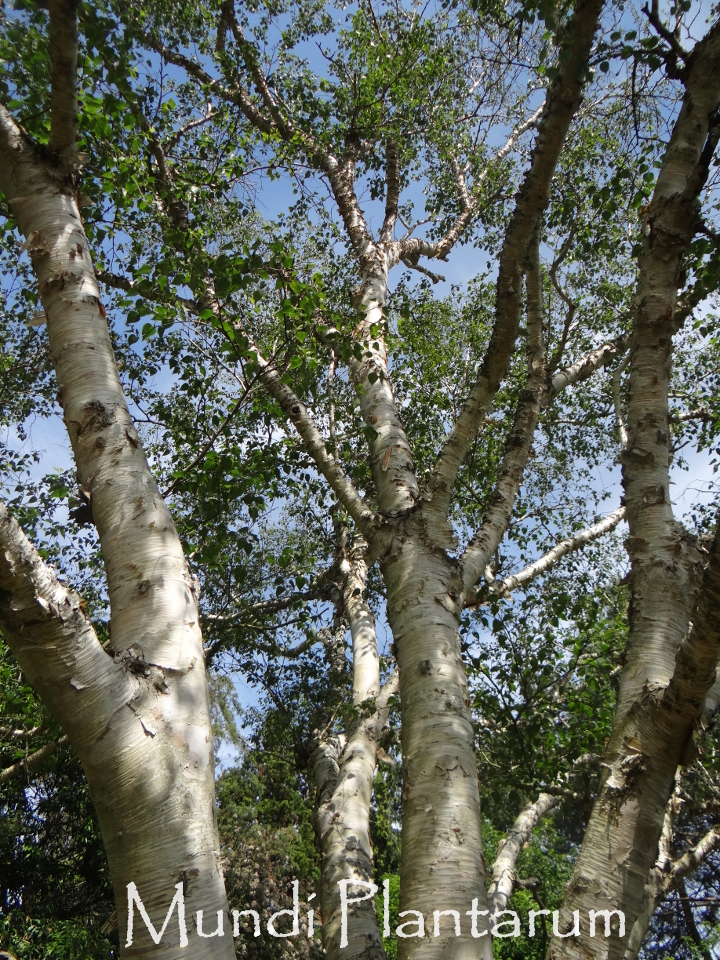 Bouleau à l'écorce totalement blanche, intense, s'exfoliant en quelques taches plus foncées. Hauteur 20m. Très beau en cepée.