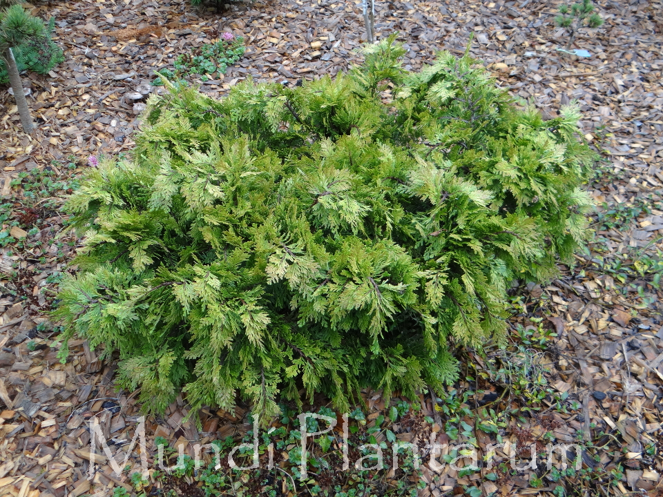 Calocèdre miniature au port particulièrement irrégulier et pitorresque et rameaux retombants. Feuillage vert clair aux reflets jaunes. Hauteur de 1,50m.