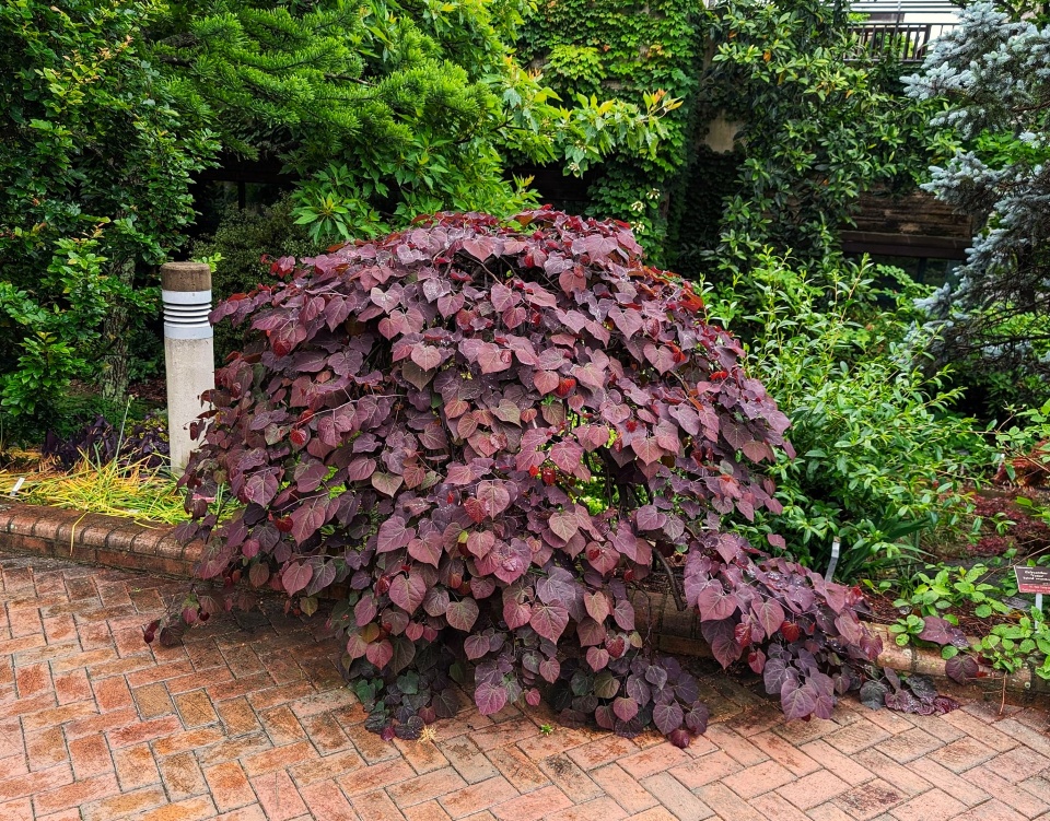 Petit arbre de Judée au port pleureur, colonne aux rameaux retombants. Feuilles pourpre violet et rouge orange en automne. Hauteur de 2m.