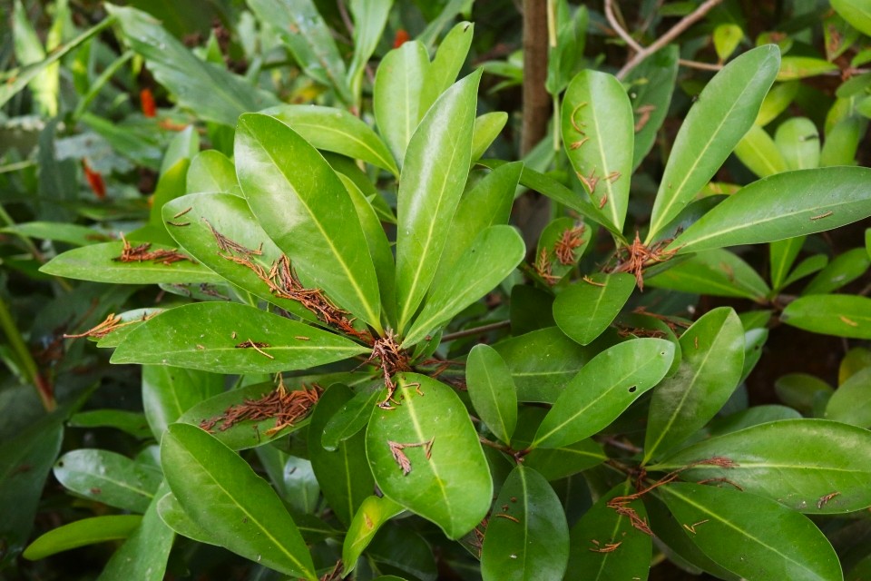 - FORME: Les feuilles sont ovales, coriaces et brillantes, d'environ 5 à 15 cm de long.