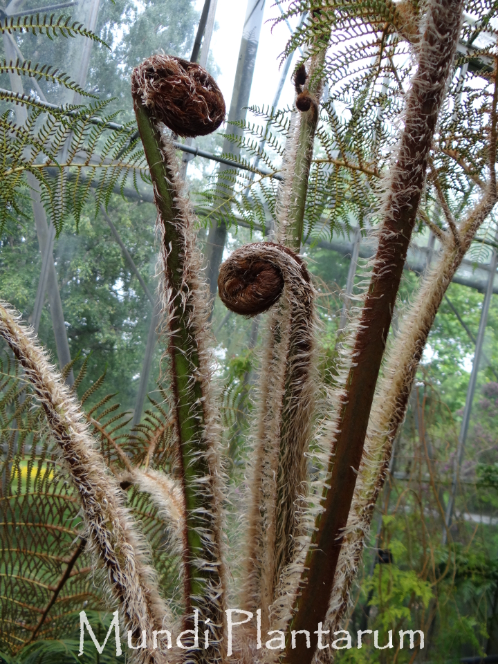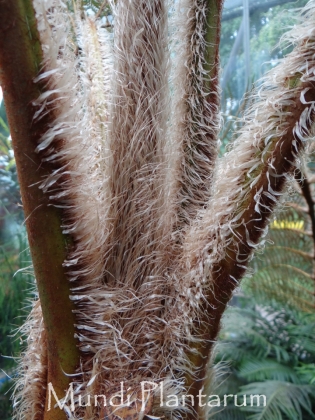 Fougère arborescente aux frondes gracieuses et finement découpées, couvertes de poils doux, presque laineux.
