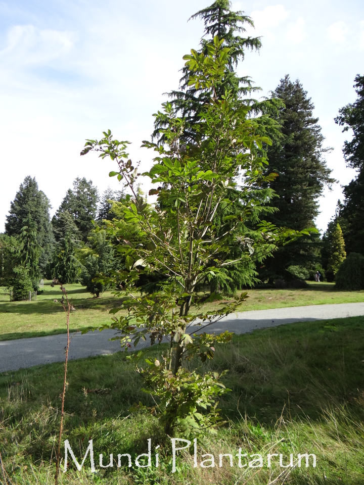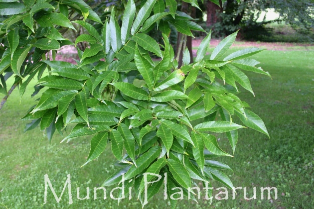 Frêne originaire de Chine aux grandes feuilles composée, vert luisant. Base du pétiole bulbeuse. Hauteur de 18 à 25m.