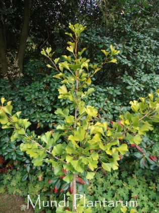 Ginkgo au port plutôt érigé, ouvert, feuilles étroites et profondément bilobées, vert puis jaune en automne.
