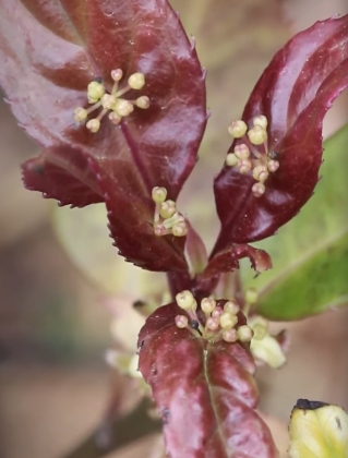 La principale caractéristique (et curiosité) des Helwingia est leur floraison insolite. Celle-ci émerge directement au milieu de la nervure des feuilles.