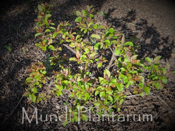 Pommier décoratif nain au port compact. Feuilles teintées de pourpre au printemps. Fleurs roses foncées. Hauteur 1m.