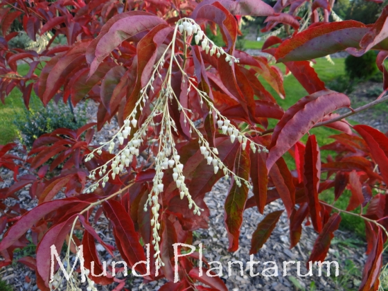 Andromède arborescent aux feuilles retombantes, rouge éclatant en automne. Grappes de clochettes blanches tardives, suivies de fruits violets. Hauteur de 12m.