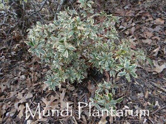 Andromède nain au feuillage marginé de blanc crème à rose au printemps. Fleurs blanc en avril-mai. Hauteur: 1m.