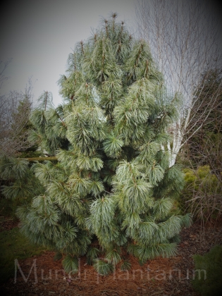 Pin blanc de Corée au port pyramidal. Longues aiguilles souples lignés de jaune en hiver et de blanc donnant un aspect bleuté jaune. Hauteur 4m.