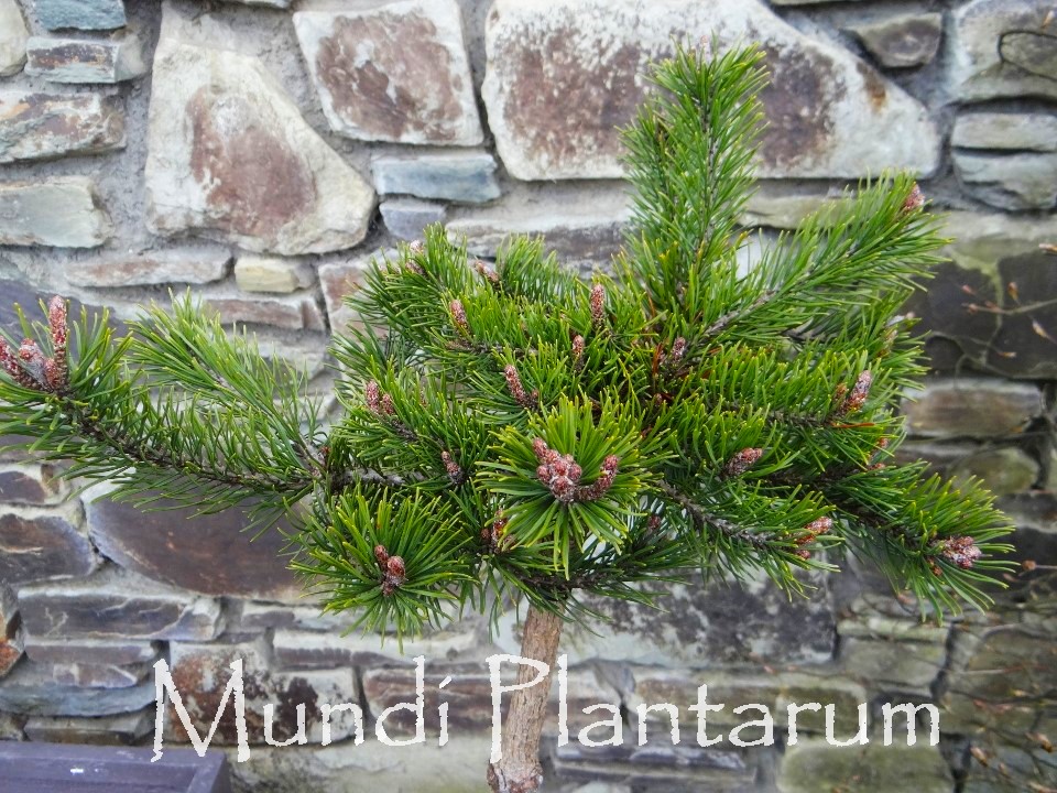 Pin nain étalé aux rameaux ouverts irrégulier. Aiguilles moyenne vert légèrement gris. Hauteur 20-30cm.
