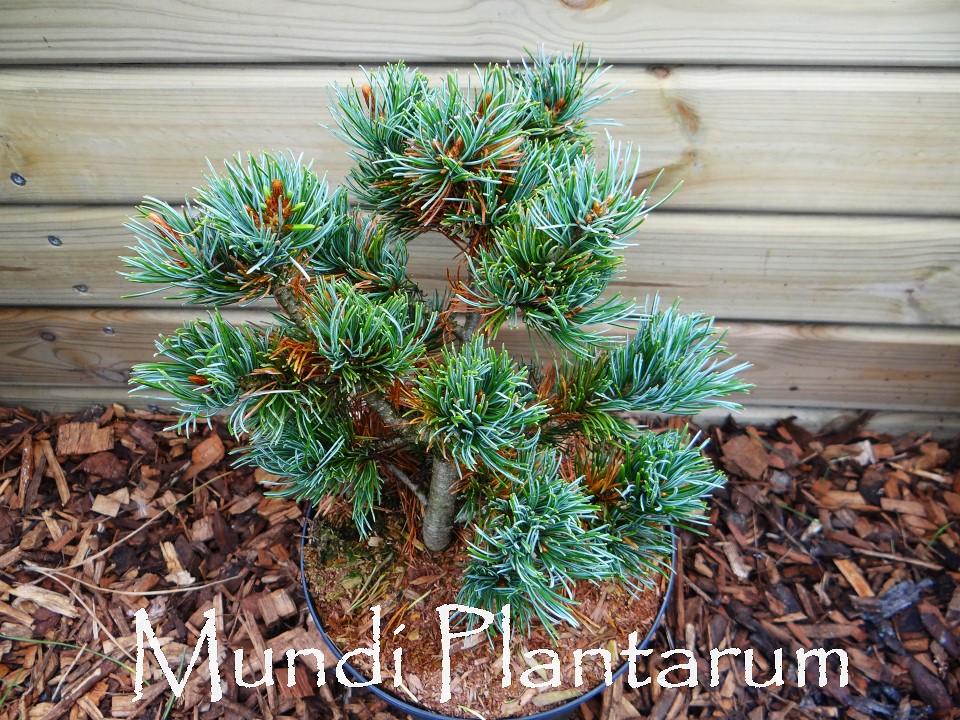 Pin nain au port trapu et arrondi. Aiguilles de taille moyenne vert bleuté intense, revers blanc. Hauteur 1m.