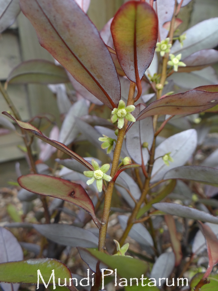 Petit arbuste originaire de Nouvelle-Zélande au feuillage persistant très coloré de pourpre, gris, rouge et vert sur les nouvelles pousses. Port arrondi et compact. Hauteur de 1,2m.