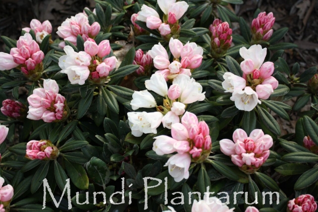 Petit rhododendron au port compact, plus large que haut. Nouvelles pousses blanc éclatant pruineux. Fleurs blanc teinté de rose en avril-mai. Hauteur 70cm.