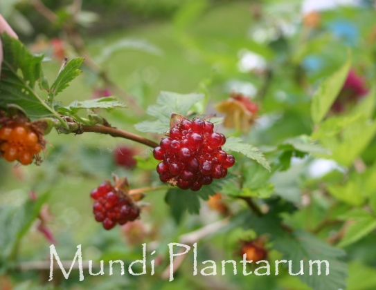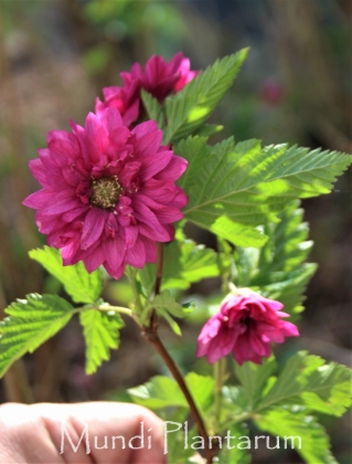Arbuste aux branches arquées. Fleurs roses foncées doubles en avril. Mûres orangées et comestibles. Hauteur 1,5m à 2m.