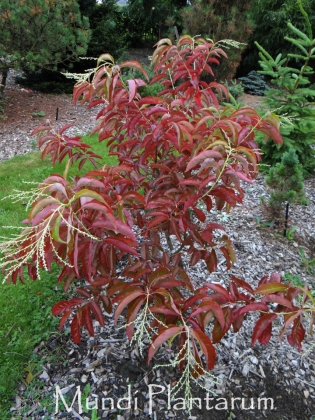 Andromède arborescent aux feuilles retombantes, rouge éclatant en automne. Grappes de clochettes blanches tardives, suivies de fruits violets. Hauteur de 12m.