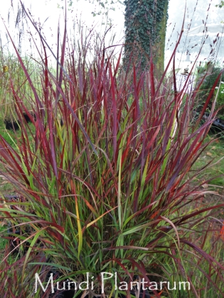 Graminée aux chaumes verticaux, feuilles vert pour rouge pourpré, floraison aérienne en plumets. Hauteur 90cm.