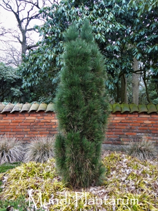 Pin nain au port colonnaire trapu, dense. Aiguilles vert sombre de grande taille. hauteur 5m, largeur 1m.